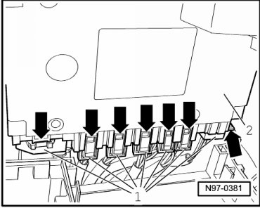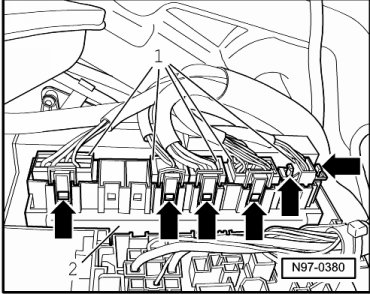 - Release locking mechanisms of multi-pin harness connectors - arrows - and disconnect multi-pin harness connectors - 1 - from Vehicle Electrical System Control Module (J519) - 2 -.