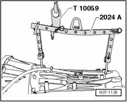 - Fasten engine sling 2024 A with shackle T10059 to shop crane VAS 6100 as shown in the illustration.