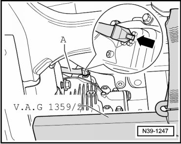 - Place the engine and transmission holder (VAG 1383 A) and a wooden block - A - under the subframe and lightly press against it.