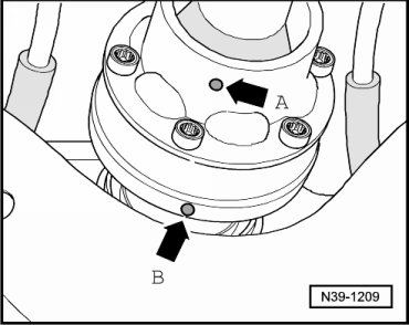 - If this marking is not present, then mark in color the position of driveshaft flange - arrow A - to rear final drive - arrow B -.