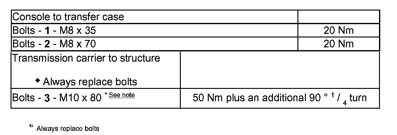 The various options result in the following fastening points for console to transfer case and transmission carrier to structure:.