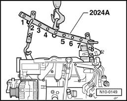 - Attach lifting tackle 2024A as follows and lift off engine/transmission jack V.A.G 1383 A with workshop crane.