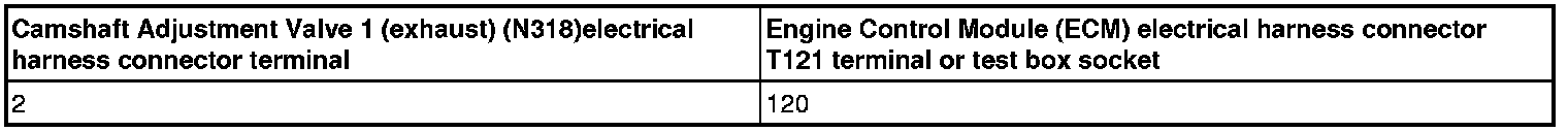 - Using a Multimeter, Check the Camshaft Adjustment Valve 1 (N205) or Camshaft Adjustment Valve 1 (exhaust) (N318) electrical harness connector terminal 2 to the Engine Control Module (ECM) electrical harness connector for an open circuit.