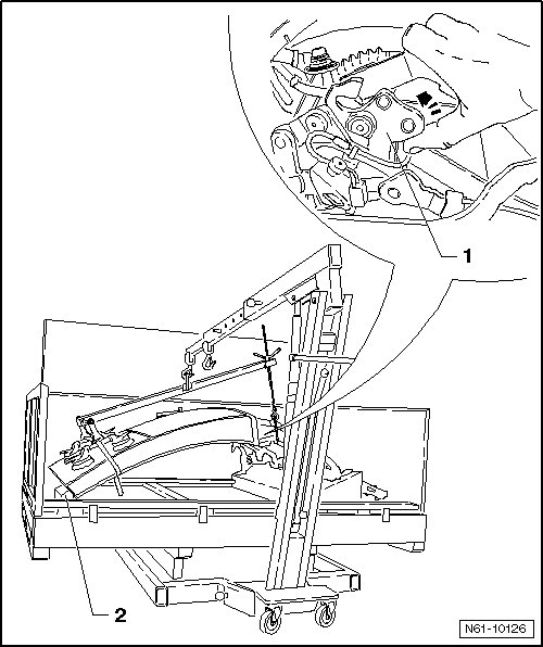 - Open roof pillar front locking mechanism - 2 - by pressing rear locking hooks - 1 - with hydraulic cylinder - arrow -.