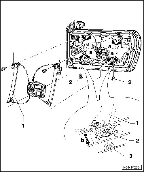 - Rotate window regulator - 1 - around cables until regulator can be inserted in door - arrows a -.