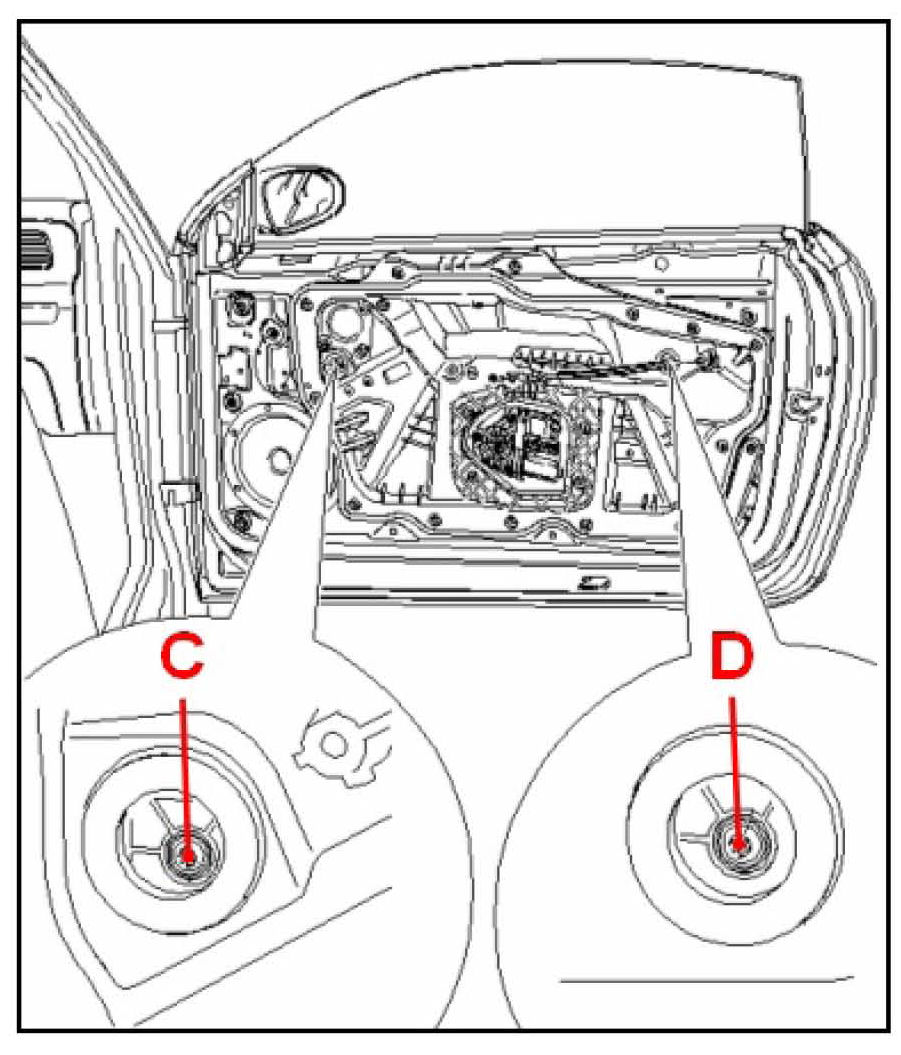 ^ Lower the door window till the two pinch bolts (C, D) are accessible through the opening.