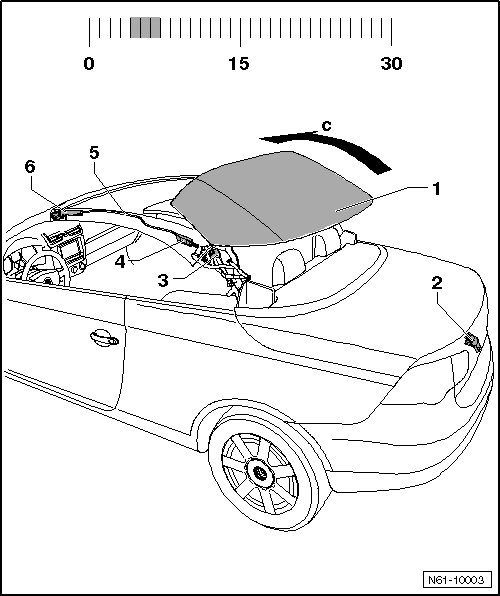 Hydraulic cylinder - 3 - moves main hinge - 2 - with entire roof for storage in luggage compartment - arrow a -.