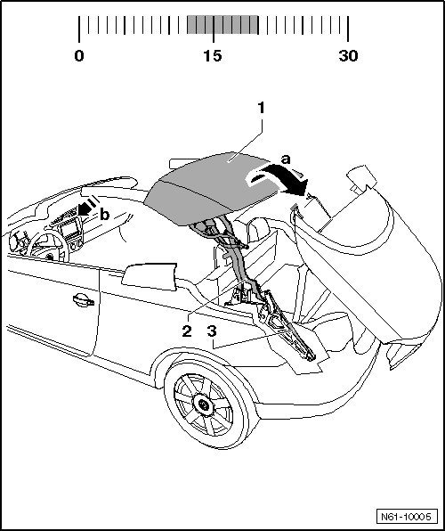 When roof - 1 - is in last third of the opening sequence - arrow a -, the roof pillars are tilted to the side while being controlled by a slotted guide rail - arrow b -.