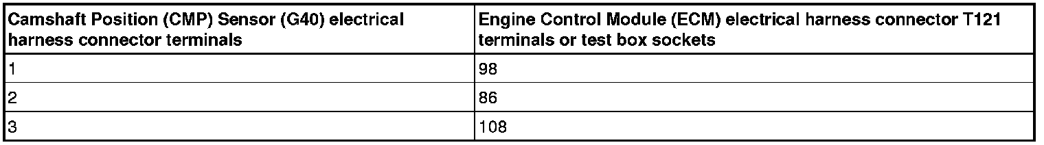 - Using a multimeter, Check the Camshaft Position (CMP) Sensor (G40) electrical harness connector to the Engine Control Module (ECM) electrical harness connector T121 for resistance.
