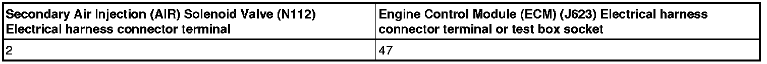 - Using a multimeter, check the Secondary Air Injection (AIR) Solenoid Valve (N112) electrical connector terminal 2 to the Engine Control Module (ECM) (J623) electrical harness connector T121 terminal 47 for resistance.