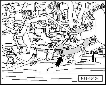 - Disengage the quick acting coupling - arrow - and disconnect the coolant hose from the radiator.