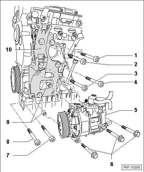 - Loosen A/C compressor, unscrew hex-bolts - 6 -. Remove A/C compressor from auxiliary component bracket and secure to body with appropriate material (e.g. welding wire) => [ Securing A/C compressor to body ]