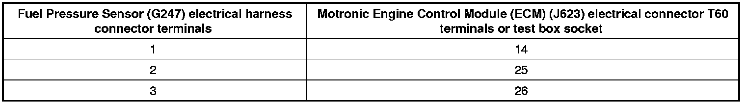 - Using a Multimeter, check the Fuel Pressure Sensor (G247) electrical harness connector terminals to the Motronic Engine Control Module (ECM) (J623) electrical harness connector T60 terminals for resistance.