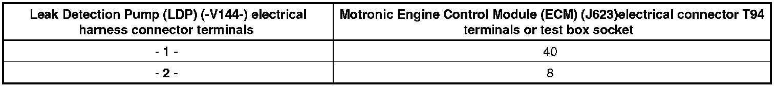 - Using a Multimeter, check the Leak Detection Pump (LDP) (-V144-) electrical connector terminal 1 to Motronic Engine Control Module (ECM) (J623) electrical connector T94 terminal 40 for resistance.
