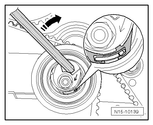 - Check the tension of the toothed belt again. Target value: the tab and notch are positioned across from each other.