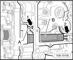 - Make sure alignment pin -A- in transmission housing -arrow 1- and sensor arm -B- in guide -arrow 2- are seated correctly on transmission housing.