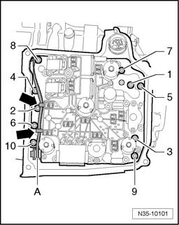- Pull Mechatronic out of transmission housing far enough until sensor arm -B- on rear side is no longer located in transmission housing.