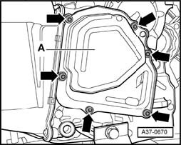 - Set new oil pump cover -A- in place and tighten bolts -arrows- in diagonal sequence and in multiple stages to 8 Nm.