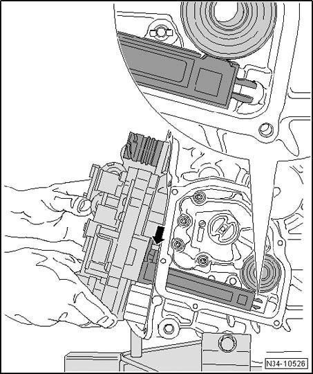 - Carefully place Mechatronic on alignment pin -arrow-. Make sure the sensor arm is in the installation position.