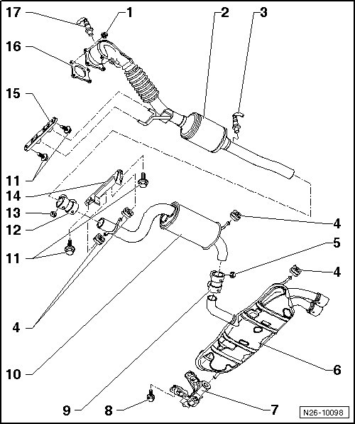 • After exhaust system repairs, make sure the exhaust system is not under stress and is far enough from the body. If necessary, loosen the clamping sleeve and align the muffler and exhaust pipe so that there is adequate distance to the body and that the weight is evenly distributed among the suspended mounts.