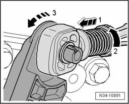- Press tab -arrow 1- (see previous illustration) down as far as the stop and remove the relay lever together with the cable retainer. Move it in the operating direction when doing so.