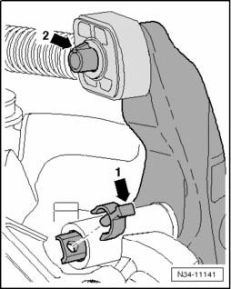 - Remove the clip -arrow 1- and the relay lever together with the cable retainer.