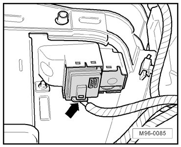 - Disengage the retaining tabs - arrows - and remove the fuel filler/rear lid remote unlocking button from the door trim.