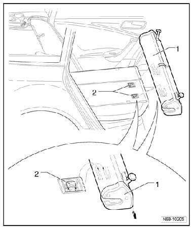 - Pull the screen separator wall - 1 - outward in - direction of arrow - out of the mounts - 2 - in the right rear seat backrest.