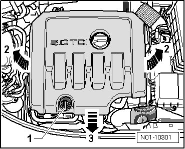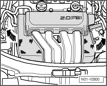 - Disengage engine cover at the retaining points - arrows - and remove engine cover upward.