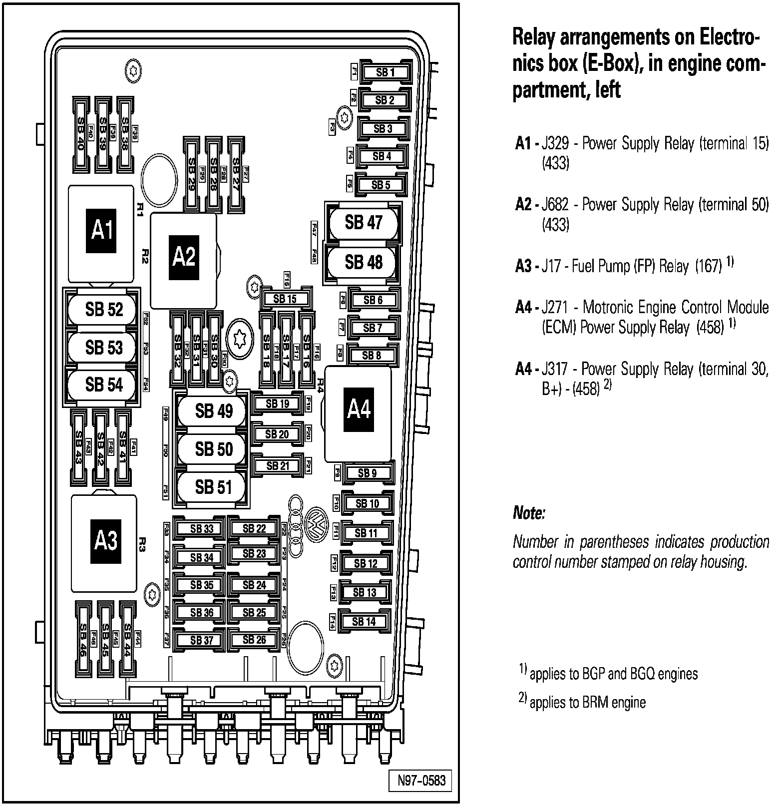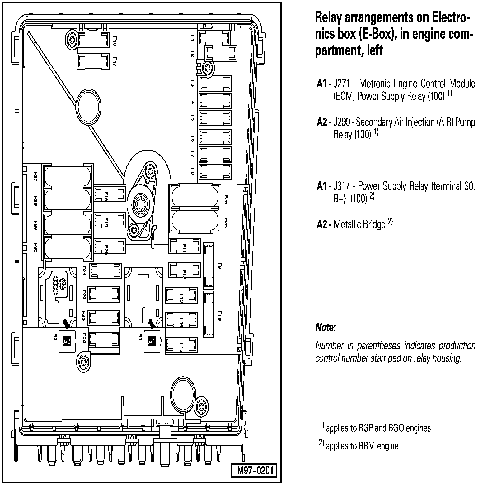 Relay Arrangements on Electronics Box (E-Box), In Engine Compartment, Left