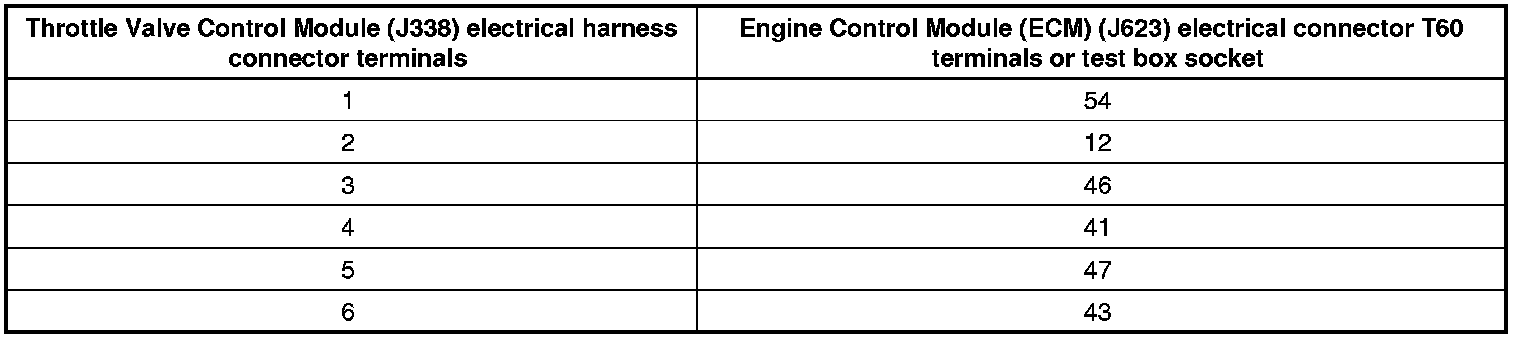 - Using a multimeter, check the Throttle Valve Control Module (J338) electrical harness connector terminals to the Engine Control Module (ECM) (J623) electrical harness connector T60 terminals for an open circuit according to the wiring diagram. Refer to Wiring Diagrams for pin locations.