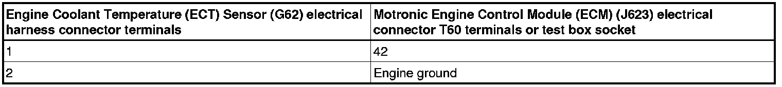 - Using a multimeter, check the signal circuit of the Engine Coolant Temperature (ECT) Sensor (G62) electrical harness connector terminal 1 to engine ground.
