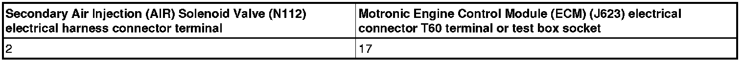 - Using a multimeter, check the Secondary Air Injection (AIR) Solenoid Valve (N112) electrical harness connector terminal 2 to the Motronic Engine Control Module (ECM) (J623) electrical harness connector T60 terminal 17 for an open circuit.