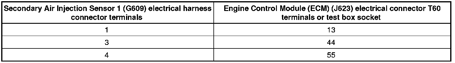 - Using a multimeter, check the Secondary Air Injection Sensor 1 (G609) electrical harness connector terminals to the Engine Control Module (ECM) (J623) electrical harness connector T60 terminals for an open circuit. Refer to Wiring Diagrams for pin locations.