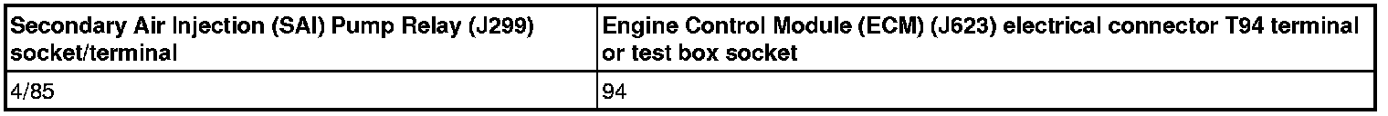 - Using a multimeter, check the Secondary Air Injection (SAI) Pump Relay (J299) socket 4 (relay terminal 85) to the Engine Control Module (ECM) (J623) electrical harness connector T94 for resistance. Refer to Wiring Diagrams for pin locations.