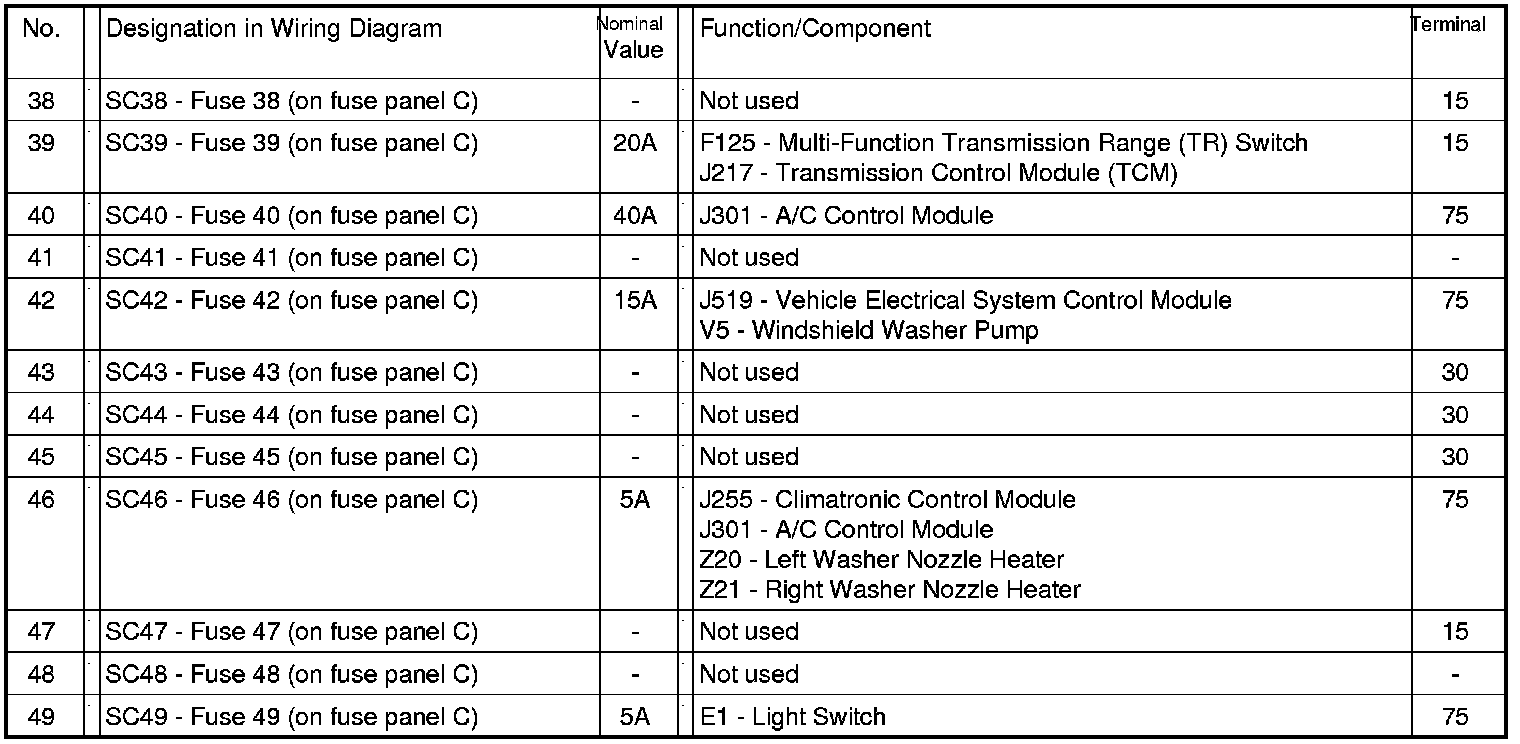 Fuses (SC) on fuse panel C (electronics box Low), from May 2005