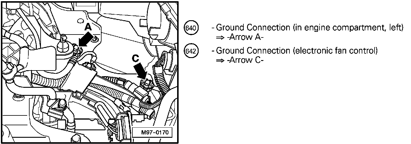 640 - Ground Connection (In Engine Compartment, Left), 642 - Ground Connection (Electronic Fan Control):