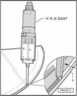 - Using double cartridge pistol VAS 5237, apply adhesive material all around on primed area - 1 - and onto cut back adhesive head at right angle to window.