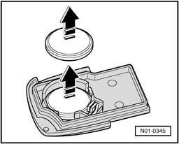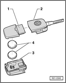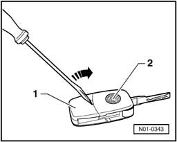 - Insert a screwdriver in the slot between the transmitter unit - 1 - and the main key 2.