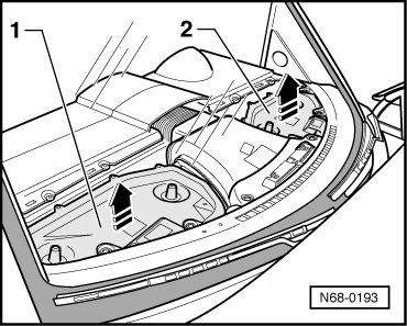 - Lift right cover - 1 - of plenum chamber in center of instrument panel - arrow A - and thereby unclip (front edge clips, back edge clamps).