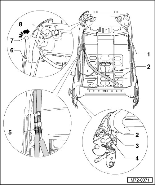 - Unclip clip - 6 - and remove cable - 2 - from backrest frame - 1 -.