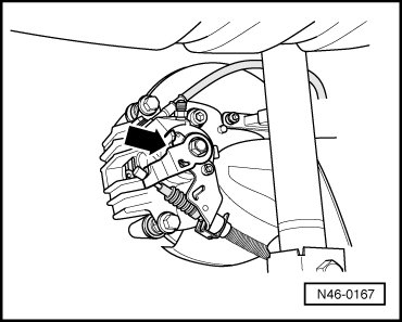 - Parking brake lever in released position. Tighten adjustment nut enough that the levers - arrow - lift off stops at brake calipers.