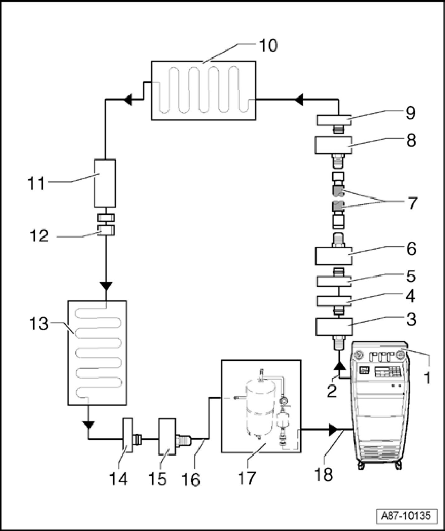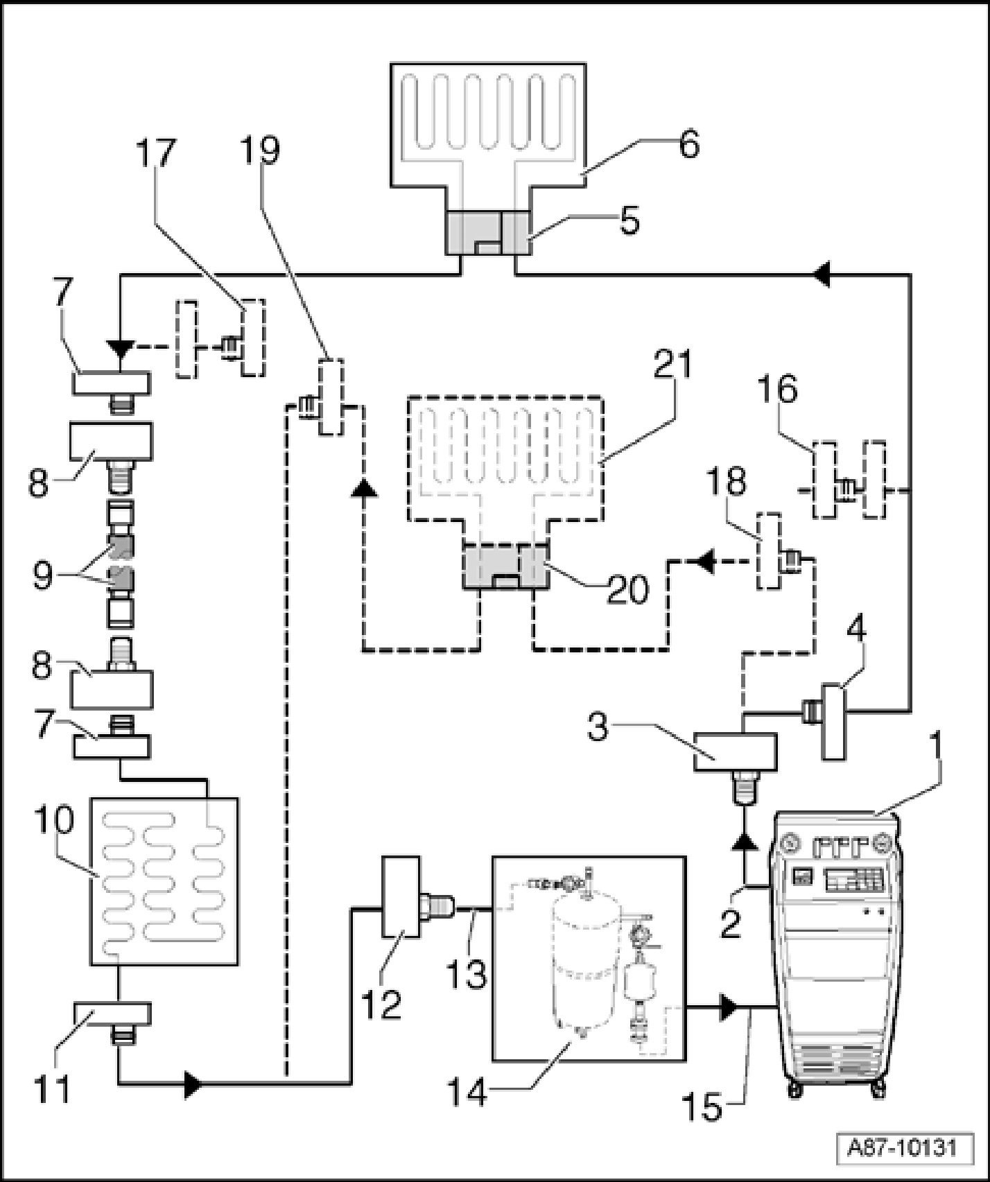 - Set up Refrigerant Circuit Flushing Device VAS 6336/1 or Refrigerant Circuit Flushing Device VAS 6337/1 between service station and refrigerant circuit return line.