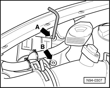 Adjuster is located on rear side of fog lamp - arrow A - and can be adjusted using a hex socket - B -.
