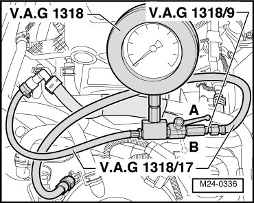 - Connect the (VAG 1318) with (VAG 1318/23 ) and (VAG 1318/17) to the fuel supply line.