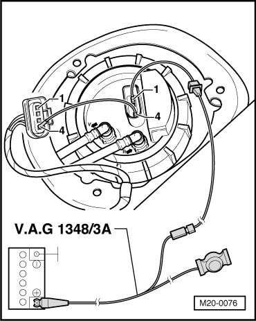 - Connect the (VAG 1348/3A) with an adapter cable to terminal - 1 - on the fuel pump and to the battery positive (+). The illustration shows the plastic fuel tank.