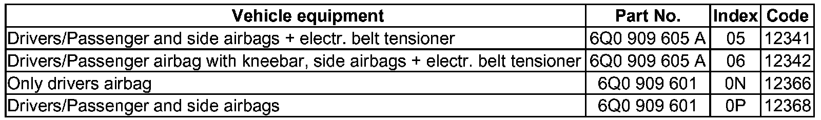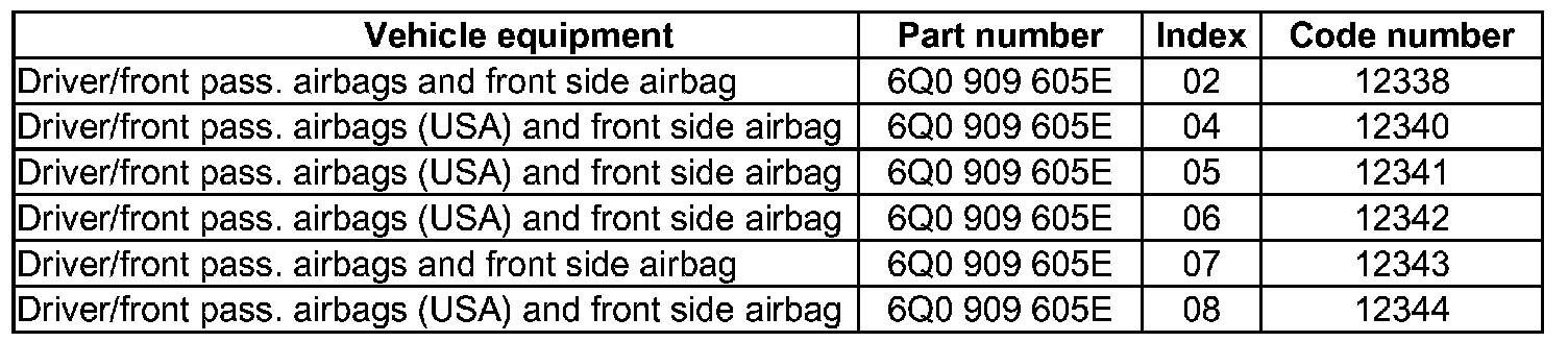 Additional code numbers (Airbag Control Modules (EXCEPT 6N0 or 1J0))
