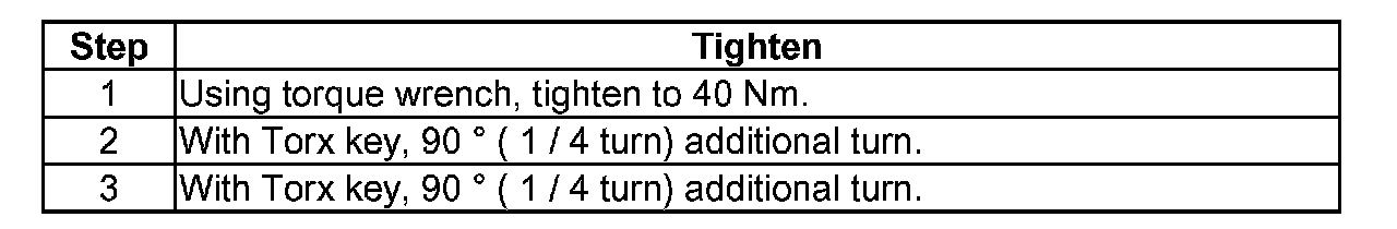 Tighten 40 Nm plus an additional 1/4 turn (90 degree)