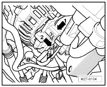- Remove the nut - 1 - (terminal 30/B+) and disconnect the connector - 2 -.