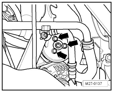 - Remove the bolts - arrows - from the power steering pump.